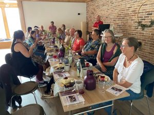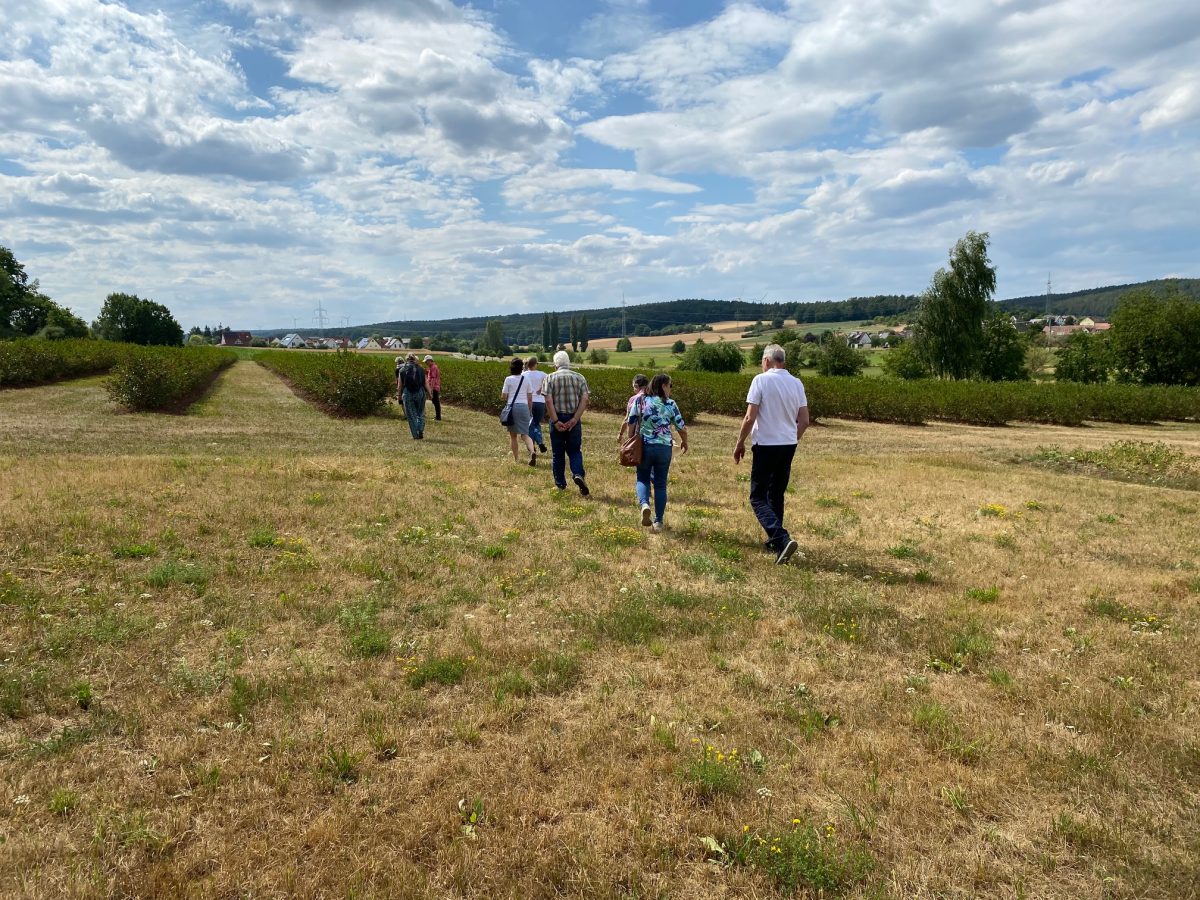 Am Sonntag, 13. Juli 2025, waren wir auf der Aronia Alm in Mittelfranken. Zum Empfang gab‘s ein Aronia-Erfrischungsgetränk, dann Kaffee, Aronia-Tee, Kuchen, Aronia-Energie-Bällchen und verschiedene Aronia-Produkte zum Probieren. Anschließend erhielten wir per Power-Point-Präsentation eine Einführung zur Aronia-Beere, ihren Anbau, ihre Wirkstoffe und die Aronia-Produkte. Dann ging es auf ein Feld nahe beim Hof, wo wir die Aronia-Kulturen in langen Reihen und Abständen von fünf Metern näher betrachten konnten.
