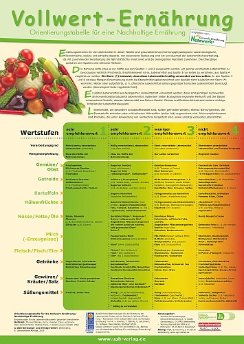 „Von „sehr empfehlenswert“ bis „nicht empfehlenswert“ teilt die Orientierungstabelle zur Vollwert-Ernährung alle Lebensmittel übersichtlich in vier Wertstufen ein. Auf einen Blick können Sie erkennen, wie Sie Ihren Speiseplan sowohl nach ernährungsphysiologischen als auch nach ökologischen und sozialen Aspekten am besten zusammenstellen können.“
